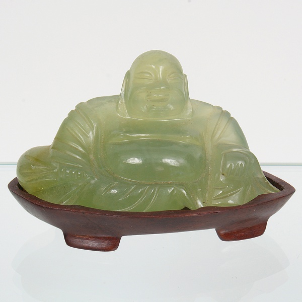 • Escultura representando Budai, personagem da tradição chinesa, executada em material pétreo translúcido de tonalidade verde clara, compatível com jade ou serpentina, entalhada em bloco único. Figura representada sentada, com cabeça calva, fisionomia sorridente, olhos semicerrados, abdômen proeminente, vestes estilizadas com pregas incisas e braços apoiados lateralmente, integrados ao corpo escultórico, apresenta trabalho de entalhe manual, com modelagem contínua, volumes arredondados e acabamento por polimento, evidenciando translucidez irregular e variações naturais do material. Assentada sobre base independente em madeira, de coloração vermelha. Medidas: Alt.: 5 x Comp.: 9,5 x Larg.: 4,5 cm.