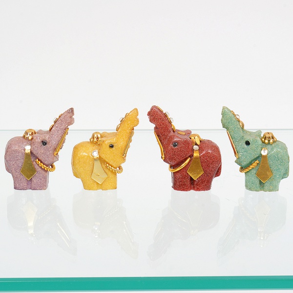 • Conjunto composto por quatro(04) esculturas representando elefantes, executadas em resina moldada com pigmentação em diferentes tonalidades, apresentam modelagem figurativa simplificada, com corpo maciço, tronco elevado, orelhas laterais estilizadas, base plana e proporções compactas, adornadas com aplicações decorativas metálicas em tom dourado, compostas por elementos lineares fixados à tromba, argolas metálicas aplicadas à região do pescoço e plaquetas decorativas laterais. Medidas: Alt.: 5 x Comp.: 4 x Larg.: 2 cm; Alt.: 5 x Comp.: 5 x Larg.: 2,5 cm.
