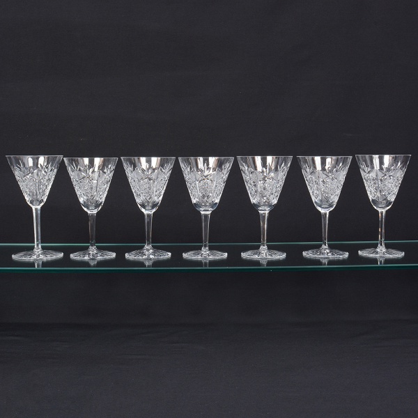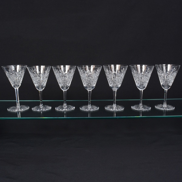 • Exuberante conjunto de taças de pé alto, para vinho branco, em cristal europeu, provavelmente   tcheco, diáfano e incolor. Bojo obcônico, profusamente talhado com padrão de folhas estilizadas, estrelas e formas geométricas em relevo, organizado em painéis verticais facetados, fuste longo de seção hexagonal, base circular, fundo com lapidação radial em estrela, com raios  partindo do centro em disposição simétrica. Composto de sete(07) unidades. Medidas: Alt.: 18 x Diam.: 10 cm.