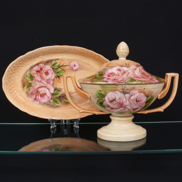 • Porcelana Schmidt - Brasil(Fundada em 1945). Elegante sopeira com tampa e presentoir em porcelana nacional, decorada à mão com motivos florais policromos, flores de tonalidades rosa e verde, dispostas em composição contínua no bojo e replicados no presentoir. Corpo de perfil bojudo, assente sobre pé oblongo elevado. Tampa abobadada, encimada por puxador em botão ovoide, maciço, integrado à modelagem da peça, alças laterais aplicadas e vazadas, de perfil recurvo, com extremidades espessadas e transição suave para o bojo. Presentoir oval, de borda elevada, decorada com volutas, treliças e perolados relevados na própria pasta. Decoração executada sobre o esmalte. Apresenta marcas de uso compatíveis com o tempo. Marca da manufatura ao fundo. Medidas: Sopeira: Alt.: 26 x  Comp.: 31,5 x Larg.: 16,5 cm; Presentoir: Alt.: 3,5 x Comp.: 36,5 x Larg.: 23 cm.