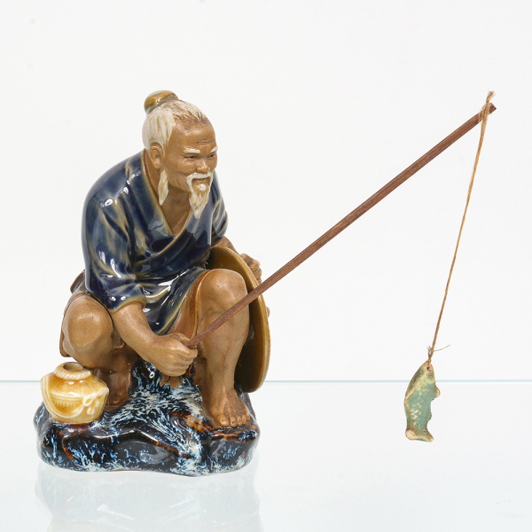 • Escultura representando homem pescadondo na beira do riacho, executada em cerâmica moldada, com corpo oco e acabamento em vidrados policromos, apresenta barba bipartida e bigode alongado, cabelos presos em coque superior, traços fisionômicos acentuados e expressão serena, enverga túnica de mangas curtas em vidrado azul, cingida à cintura, com partes do corpo em vidrado marrom-claro; na mão esquerda segura chapéu típico, com decoração radial em relevo sob vidrado translúcido âmbar, mão direita segura vara de pesca, com conformação compatível para o encaixe da mesma; base integra a composição escultórica, modelada como afloramento rochoso, com vidrado de efeito marmorizado em tons escuros, evocando ambiente fluvial ou lacustre; apresenta orifício circular na base, típico de processos de queima e ventilação do corpo cerâmico. Base não vidrada, com marca em relevo CHINA e inscrição numérica/incisa adicional, indicando produção seriada, compatível com manufatura decorativa chinesa do século XX, voltada ao mercado ocidental, inspirada na iconografia tradicional do pescador como símbolo de simplicidade, trabalho e sabedoria. Medidas: Alt.: 13,5 x Comp.: 8,5 x Larg. 8 cm.