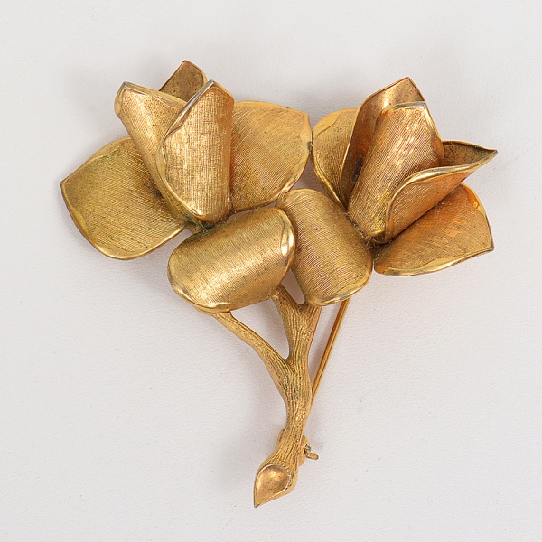 • Broche floral em metal dourado, representando ramo com flores estilizadas, composto por múltiplas pétalas conformadas individualmente, com acabamento escovado acetinado e bordas polidas. Estrutura formada por haste central sinuosa, da qual partem os elementos florais articulados, flores apresentam pétalas côncavas sobrepostas, com nervuras finamente marcadas por escovamento direcional, conferindo contraste entre superfícies foscas e áreas de brilho. Verso com alfinete horizontal e fecho de segurança, integrado à estrutura metálica.Medidas: Alt.: 5,5 x Comp.: 5,5 cm.