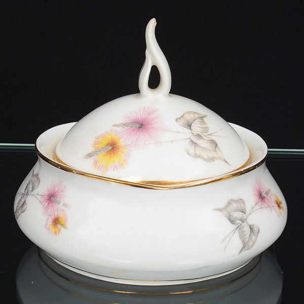 • Porcelana Real, Mauá - SP(Fundada em 1943 por Fritz Erwin Schmidt). Açucareiro em porcelana nacional da década de 1960, esmaltagem vítrea na co branca, corpo bojudo, decoração aplicada por estampagem policromada, com motivos florais estilizados compostos por flores radiais em tons de rosa e amarelo, acompanhadas por folhas em grisaille, distribuídos no corpo e na tampa, tampa abaulada com pega vazada elevada, moldada na própria porcelana, filetes dourados aplicados na borda superior do corpo e na aba da tampa. Marca da manufatura no verso. Medidas: Alt.: x Diam.: