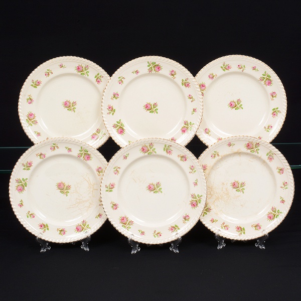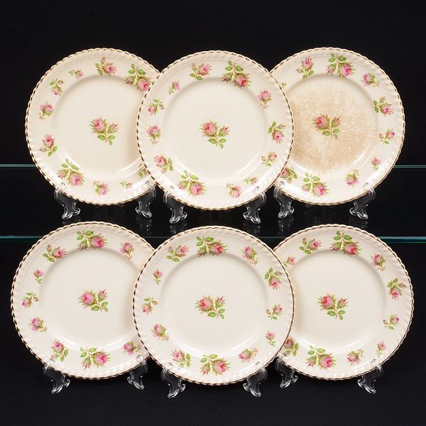 • Johnson Brothers, Staffordshire - Inglaterra(Fundada em 1883). Belíssimo conjunto de pratos rasos ingleses, da década de 1930/40, executado em faiança; esmaltagem de tonalidade marfim, dotada de decoração com padrão de flores em estampagem policromada, predominando as tonalidades verde, rosa e castanho, distribuídas ao redor da orla e ao centro, borda modelada com movimento ondulatório, contornada por friso em douradura. Composto de seis(06) unidades. Medida: Diam.: 22,5 cm. Apresentam manchas do tempo, vide foto.