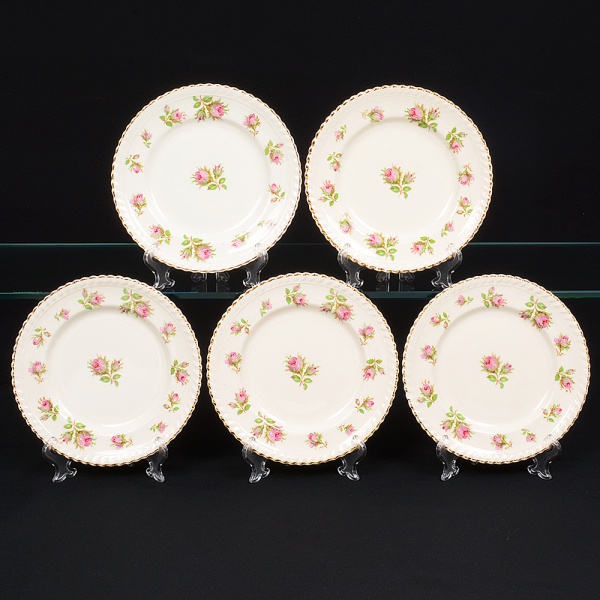 • Johnson Brothers, Staffordshire - Inglaterra(Fundada em 1883). Belíssimo conjunto de pratos para sobremesa ingleses, da década de 1930/40, executado em faiança; esmaltagem de tonalidade marfim, dotada de decoração com padrão de flores em estampagem policromada, predominando as tonalidades verde, rosa e castanho, distribuídas ao redor da orla e ao centro, borda modelada com movimento ondulatório, contornada por friso em douradura. Composto de cinco(05) unidades. Medida: Diam.: 18 cm.