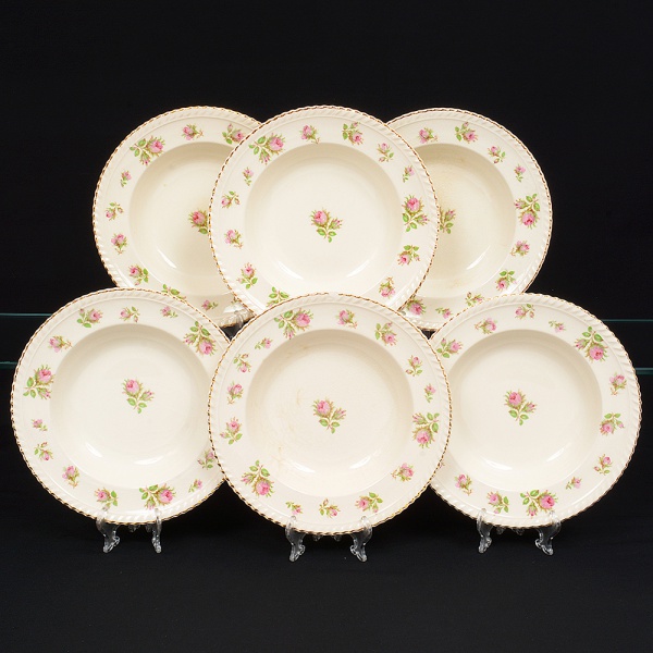• Johnson Brothers, Staffordshire - Inglaterra(Fundada em 1883). Belíssimo conjunto de pratos fundos ingleses, da década de 1930/40, executado em faiança; esmaltagem de tonalidade marfim, dotada de decoração com padrão de flores em estampagem policromada, predominando as tonalidades verde, rosa e castanho, distribuídas ao redor da orla e ao centro, borda modelada com movimento ondulatório, contornada por friso em douradura. Composto de seis(06) unidades. Medida: Diam.: 22,5 cm.