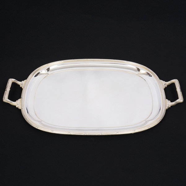 • FRACALANZA. Belíssima bandeja confeccionada em metal espessurado à prata, formato retangular arredondado, centro rebaixado, borda relevada com fileira de frisos e fitas cruzadas, padrão "Croisé", ornato replicado nas alças laterais, com terminações cinzeladas em folhagens. Marca da manufatura puncionada no verso. Medidas: Alt.: 3 x Comp.: 52(de uma alça a outra) x Larg.:  33 cm.