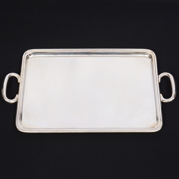 • WOLFF. Elegante bandeja confeccionada em metal espessurado à prata, formato retangular de quinas arredondadas, centro ligeiramente rebaixado, borda percorrida por contorno relevado, alças laterais em "C". Marca da manufatura puncionada no verso. Medidas: Comp.: 46 x Larg.: 27,5 cm.