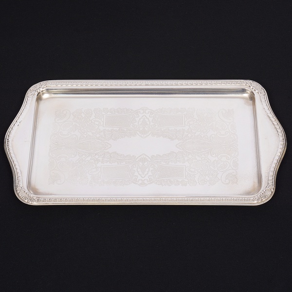 • Grande bandeja confeccionada em metal espessurado à prata, formato retangular de quinas arredondadas, borda elevada, revirada para fora e percorrida por faixa relevada, orla circundada por com sucessão de gomos verticais, obtidos através da técnica do repuxado; centro rebaixado, profusamente lavrado com composição de motivo vegetalista, alças laterais cinzeladas com reserva oblonga, frisos e terminações em folhagens. Medidas: Alt.: 5 x Comp.: 66 x Larg.: 42,5 cm.