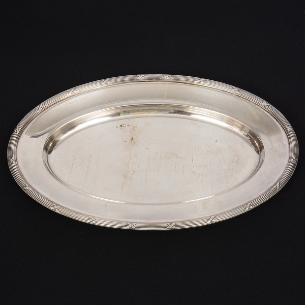 • FRACALANZA. Elegante travessa oval confeccionada em metal espessurado à prata, centro ligeiramente rebaixado, borda relevada com fileira de frisos intercalados por fitas cruzadas, padrão "croisé". Marca da manufatura no verso. Medida: Comp. 36 x Larg.: 24 cm. Apresenta marcas de uso, visíveis nas fotos. Necessita apenas de polimento.