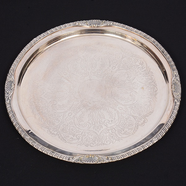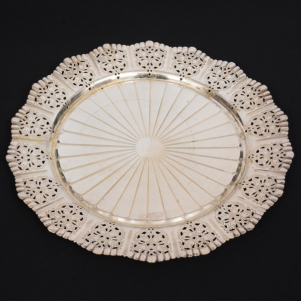 • Bandeja circular confeccionada em metal prateado,repuxado com raios incisos convergentes ao centro, orla vazada com reservas de motivois florais, borda ondulada e recortada. Medida: Diam.: