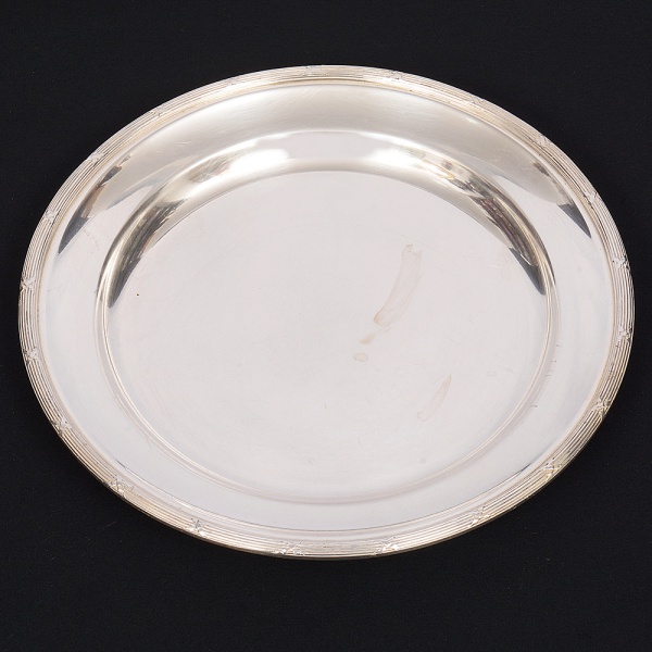 • FRACALANZA. Elegante travessa circular confeccionada em metal espessurado à prata, centro ligeiramente rebaixado, borda relevada com fileira de frisos intercalados por fitas cruzadas, padrão "croisé". Marca da manufatura no verso. Medida: Diam.: 30,5 cm.