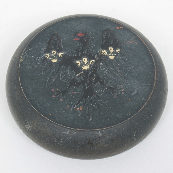 • BRONZE, um (1) peso de papel, ornado com brasão representado por águia e três coroas, medindo 8,5 cm diâmetro, sinais de uso, vide foto.