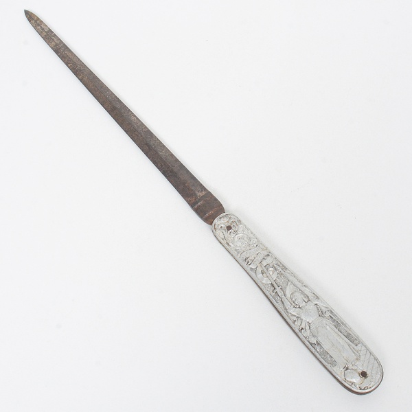 • CUTELARIA, um (1) antigo abridor de correspondências, lâmina em aço e convexa, sem gume, empunhadura em placas de alumínio relevadas com Jeanne D Arc (Santa Joana D'Arc), medindo 21,5 cm comprimento, sinais de oxidação, vide foto.