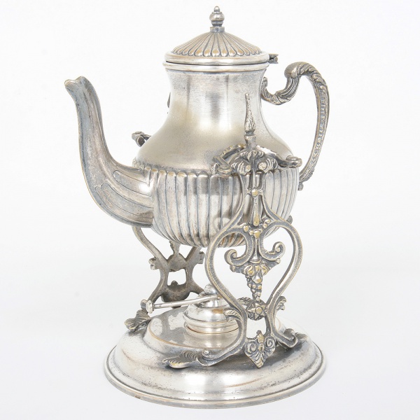 • METAL PRATEADO, um (1) antigo samovar, bule ornado em caneluras, alça relevada em volutas e elementos vegetalistas, base vazada em elementos vegetalistas, possui queimador, sem marca de manufatura aparente, medindo 29 cm altura, sinais de uso, vide foto.