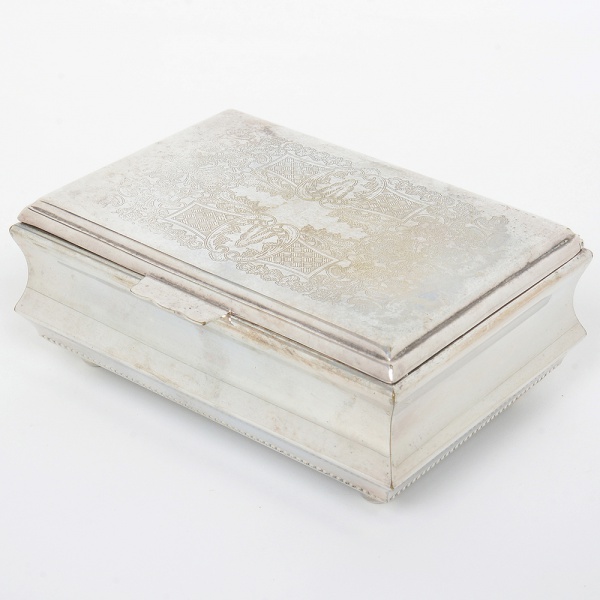 • METAL PRATEADO, uma (1) caixa retangular, tampa de abertura basculante com ornamentação em baixo relevo representando pérgulas, volutas e elementos vegetalistas, base em bolacha, laterais bombe com perolados na parte inferior, parte interna com forração em madeira, sem marca de manufatura aparente, medindo 16,5 x 11,5 x 6,5 cm, sinais de uso, vide foto.