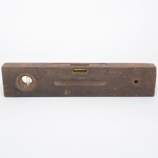 • FERRAMENTA, um (1) antigo nível, confeccionado em madeira e outros materiais, medindo 30,5 cm comprimento, sinais de uso, vide foto.