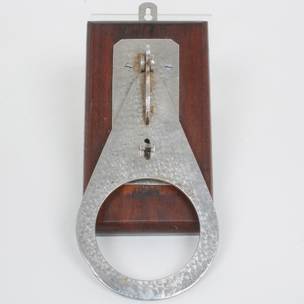 • METAL PRATEADO, um (1) suporte para fixação em parede, possui trava, utilidade ignorada, possivelmente porta copo, medindo 26 cm, fixado em madeira, sinais de uso, vide foto.