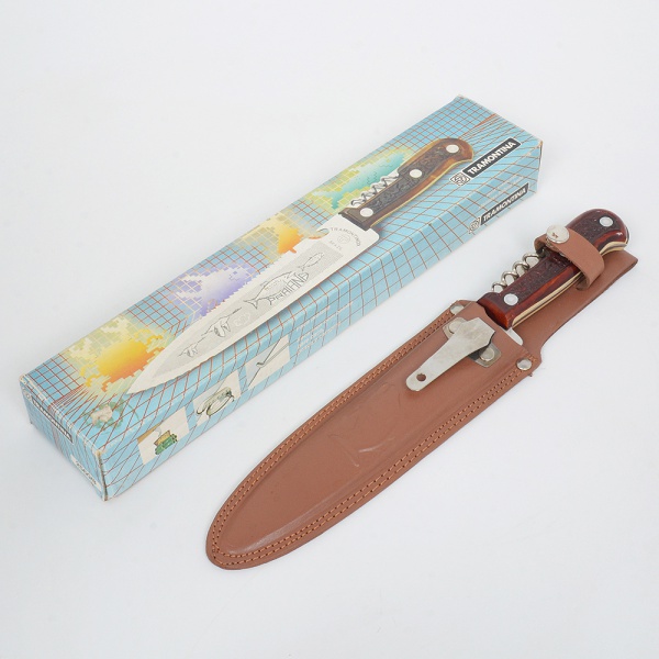 • CUTELARIA, uma (1) faca para peixe, marca TRAMONTINA, modelo PRAIANA, com saca rolha acoplado, empunhadura imitando osso, acondicionado na embalagem original, não aparenta ter sido usado, medindo 31 cm comprimento, bainha em couro ou símile na tonalidade castor, vide foto.