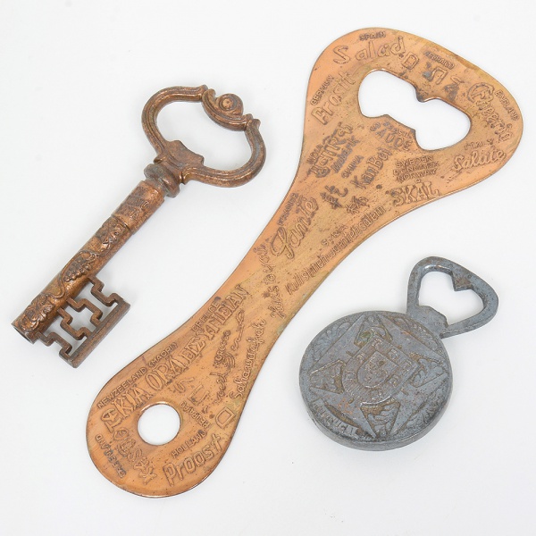 • DIVERSOS, três (3) abridores distintos, confeccionados em metal: 1 de garrafa com propaganda de bebidas variadas, medindo 24 cm; 1 de garrafa, souvenir de Portugal, medindo 9 cm, comemorativo ao IV Centenário da Morte do Infante Dom Henrique, 1560 a 1960; 1 de garrafa, formato de chave, faltando o saca rolha que seria embutido, manufatura EBERLE (Abramo Eberle 1880, Monte Magrè 1945, Caxias do Sul, veio com uma das primeiras levas de imigrantes italianos para o Brasil em 1884 junto com seus pais Giuzeppe Eberle e Luigia Zanrosso, seu pai abriu uma pequena funilaria mas como tinha que trabalhar na lavoura quem cuidava era a mãe e o pequeno Abramo ajudava na funilaria; em 1896 quando o pai resolveu vender a funilaria para concentrar os esforços da família na lavoura Abramo, com 16 anos de idade, se propôs a comprá-la do pai, em 1918 já com o nome Abramo Eberle & Cia iniciou a fabricação de talheres e utensílios de mesa, morreu em 1945 com 65 anos de idade e os filhos deram continuidade aos negócios até 1984 quando venderam para o Grupo Zivi), medindo 14 cm, todos com sinais de uso, vide foto.