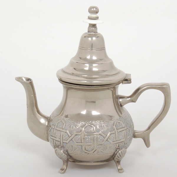 • METAL PRATEADO, um (1) bule oriental, bojo com ornamentação relevada no padrão Império Otomano, pés em concha terminando em cabriole, adorno da extremidade da tampa em polímero na tonalidade branca, marca de origem ou manufatura na base em Árabe, medindo 19 cm altura, sinais de uso, vide foto.