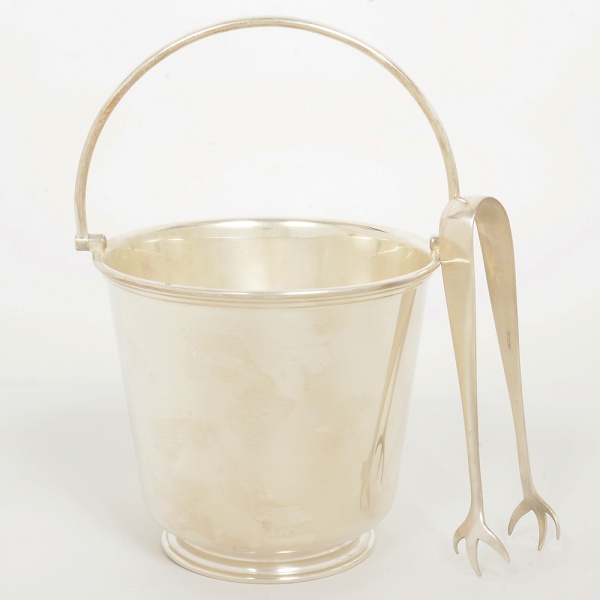 • METAL PRATEADO, um (1) balde de gelo, formato ligeiramente obcônico, pé baixo, extremidades em frisos horizontais, alça em meia cana, manufatura inglesa JAMES DIXON & SONS (tradição desde 1806), Made in England, possui retentor de gelo, medindo 13,5 cm altura e 14,5 cm diâmetro, acompanha pegador de gelo com terminação em garras, medindo 15,5 cm comprimento, todos os itens com sinais de uso, vide foto.