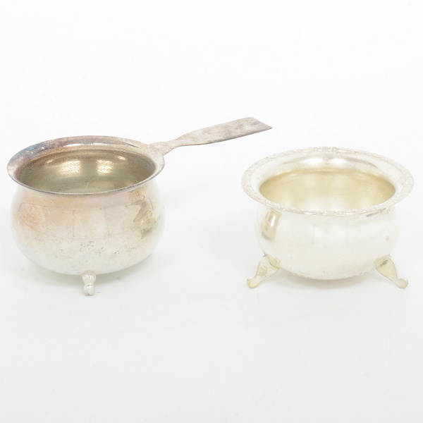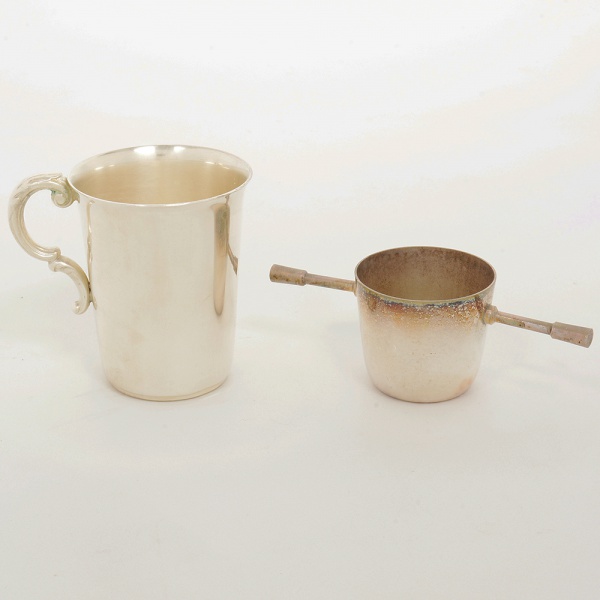 • METAL PRATEADO, dois (2) itens distintos: 1 dosador de bebidas, manufatura EBERLE (Abramo Eberle 1880, Monte Magrè 1945, Caxias do Sul, veio com uma das primeiras levas de imigrantes italianos para o Brasil em 1884 junto com seus pais Giuzeppe Eberle e Luigia Zanrosso, seu pai abriu uma pequena funilaria mas como tinha que trabalhar na lavoura quem cuidava era a mãe e o pequeno Abramo ajudava na funilaria; em 1896 quando o pai resolveu vender a funilaria para concentrar os esforços da família na lavoura Abramo, com 16 anos de idade, se propôs a comprá-la do pai, em 1918 já com o nome Abramo Eberle & Cia iniciou a fabricação de talheres e utensílios de mesa, morreu em 1945 com 65 anos de idade e os filhos deram continuidade aos negócios até 1984 quando venderam para o Grupo Zivi), medindo de uma haste a outra 11 cm; 1 pequena caneca, ligeiramente obcônica, alça relevada em volutas e elementos vegetalistas, manufatura MERIDIONAL, medindo 7 cm altura, ambos com sinais de uso, vide foto.