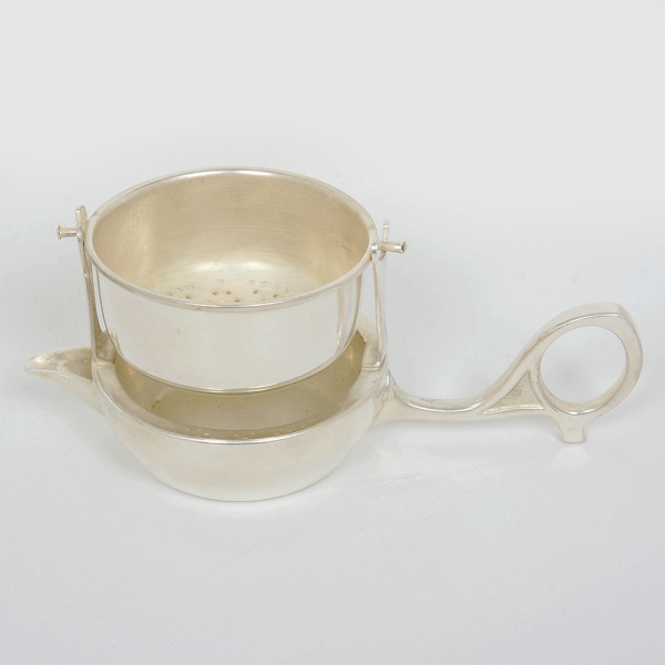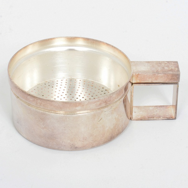 • METAL PRATEADO, um (1) infusor de chá individual, manufatura AEC (Abramo Eberle 1880, Monte Magrè 1945, Caxias do Sul, veio com uma das primeiras levas de imigrantes italianos para o Brasil em 1884 junto com seus pais Giuzeppe Eberle e Luigia Zanrosso, seu pai abriu uma pequena funilaria mas como tinha que trabalhar na lavoura quem cuidava era a mãe e o pequeno Abramo ajudava na funilaria; em 1896 quando o pai resolveu vender a funilaria para concentrar os esforços da família na lavoura Abramo, com 16 anos de idade, se propôs a comprá-la do pai, em 1918 já com o nome Abramo Eberle & Cia iniciou a fabricação de talheres e utensílios de mesa, morreu em 1945 com 65 anos de idade e os filhos deram continuidade aos negócios até 1984 quando venderam para o Grupo Zivi), medindo 12,5 cm comprimento, sinais de uso, vide foto.