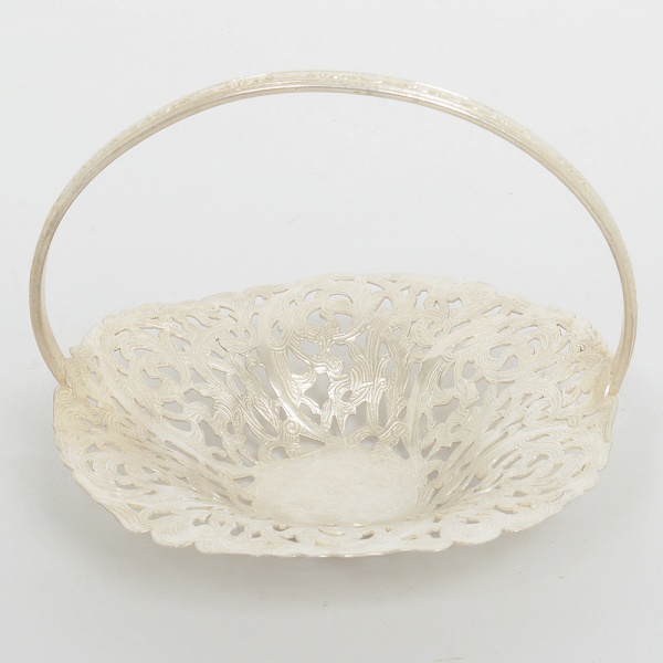 • METAL PRATEADO, uma (1) pequena fruteira com alça, formato de cesta, vazada em elementos vegetalistas, manufatura MERIDIONAL, medindo 12 x 8 cm, sinais de uso, vide foto.