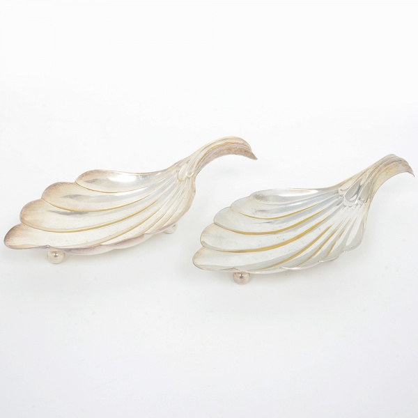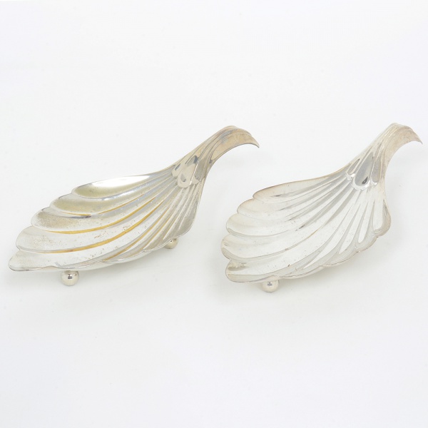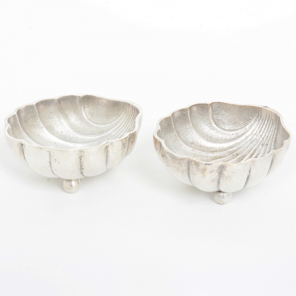 • METAL PRATEADO, par (2) petisqueiras no formato de concha bivalve, pés esféricos, medindo 10 x 8,5 x 5,5 cm, sem marca de manufatura aparente, sinais de uso, vide foto.