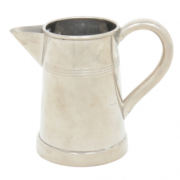 • AÇO INOX, uma (1) cremeira, formato ligeiramente cônico, ornada com frisos horizontais, alça sinuosa, marca TEIXEIRA, medindo 10 cm altura, sinais de uso, vide foto.