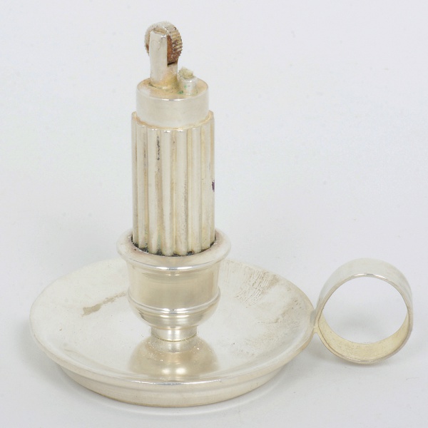 • COLECIONISMO, um (1) antigo isqueiro da marca CURZON, formato de palmatória, confeccionado em metal prateado e outros materiais, medindo 6,5 cm altura, funcionamento não testado, sinais de uso, vide foto.