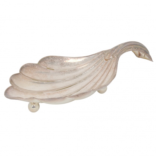 • METAL PRATEADO, uma (1) petisqueira, plissada na forma de folha, pés esféricos, manufatura EBERLE (Abramo Eberle 1880, Monte Magrè 1945, Caxias do Sul, veio com uma das primeiras levas de imigrantes italianos para o Brasil em 1884 junto com seus pais Giuzeppe Eberle e Luigia Zanrosso, seu pai abriu uma pequena funilaria mas como tinha que trabalhar na lavoura quem cuidava era a mãe e o pequeno Abramo ajudava na funilaria; em 1896 quando o pai resolveu vender a funilaria para concentrar os esforços da família na lavoura Abramo, com 16 anos de idade, se propôs a comprá-la do pai, em 1918 já com o nome Abramo Eberle & Cia iniciou a fabricação de talheres e utensílios de mesa, morreu em 1945 com 65 anos de idade e os filhos deram continuidade aos negócios até 1984 quando venderam para o Grupo Zivi), medindo 20,5 cm comprimento, sinais de uso, vide foto.