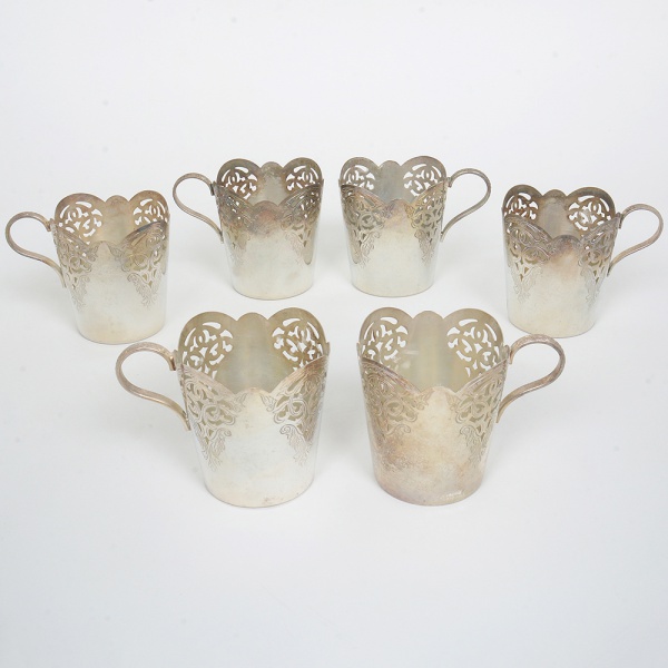 • METAL PRATEADO, seis (6) suportes para copo, obcônicos, borda recortada e vazada em elementos vegetalistas estilizados, alça relevada em texturização e elementos vegetalistas, medindo 8 cm altura e 7,5 cm diâmetro, sem marca de manufatura aparente, sinais de uso, vide foto.