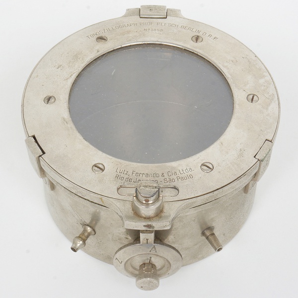 • DIVERSOS, uma (1) antiga caixa em aço para acondicionar instrumento  (faltando), marcada: TONOSZILLOGRAPH PROF. PLESCH BERLIN D. R. P. número 1858  LUTZ FERRANDO & Cia. Ltda., Rio de Janeiro  São Paulo, medindo 15,5 cm diâmetro, sinais de uso, vide foto.