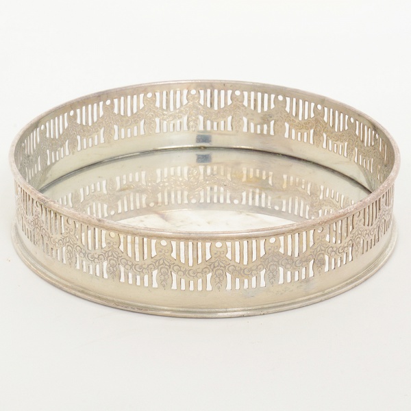 • METAL PRATEADO, uma (1) salva circular, borda vazada em gradil e relevada em guirlandas de rosas, sem marca de manufatura aparente, medindo 15 cm diâmetro, sinais de uso, vide foto.