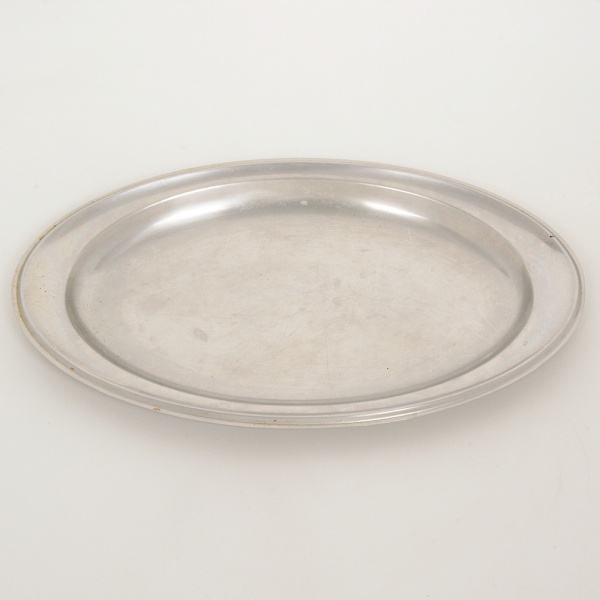 • METAL PRATEADO, uma (1) travessa oval, borda reforçada e relevada no padrão Império Napoleônico com frisos intercalados por X, manufatura WOLFF (tradição desde 1894), medindo 37 x 25 cm, sinais de uso, vide foto.
