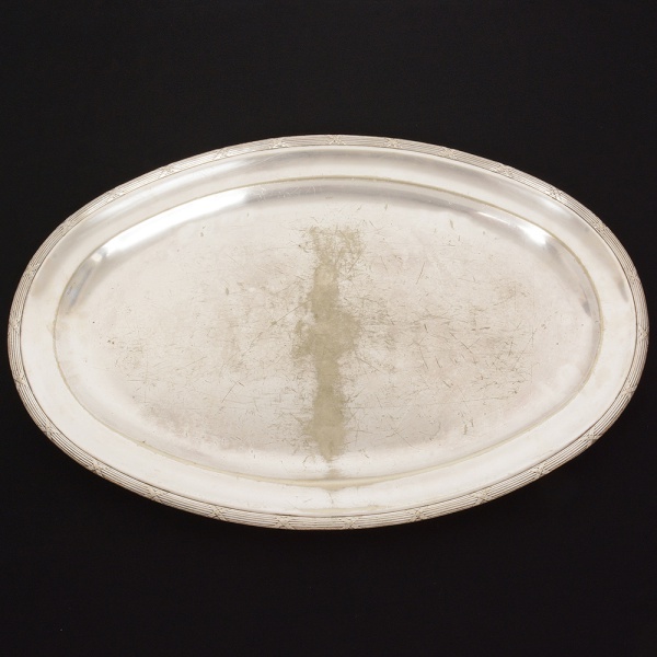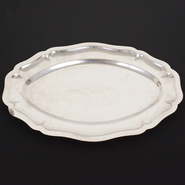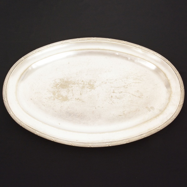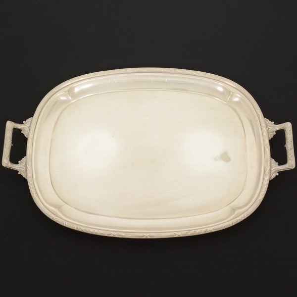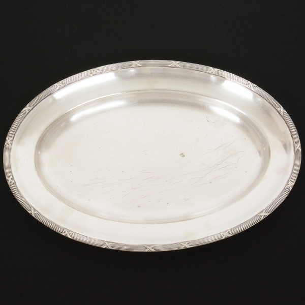 • METAL PRATEADO, uma (1) imponente travessa oval, borda reforçada e relevada no padrão Império Napoleônico com frisos intercalados por X, manufatura WOLFF (tradição desde 1894), medindo 70,5 x 46 cm, possui mossas, sinais de uso, vide foto.