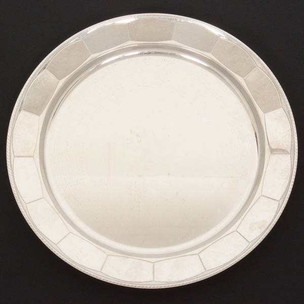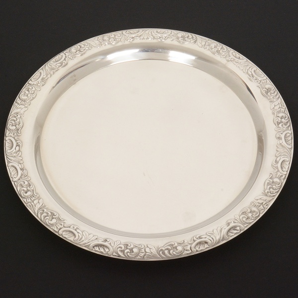 • METAL PRATEADO OU AÇO INOX, uma (1) bandeja circular, confecção mecanizada na técnica de estamparia, borda relevada em volutas e elementos vegetalistas, medindo 31 cm diâmetro, sinais de uso, vide foto.