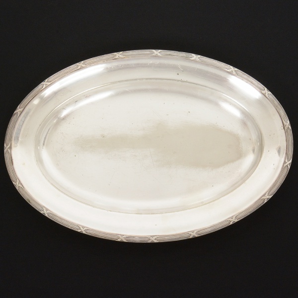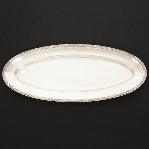 • METAL PRATEADO, uma (1) travessa oval para peixe, borda reforçada e relevada no padrão Império Napoleônico com frisos intercalados por X, manufatura WOLFF (tradição desde 1894), medindo 50 x 21 cm, sinais de uso, vide foto.