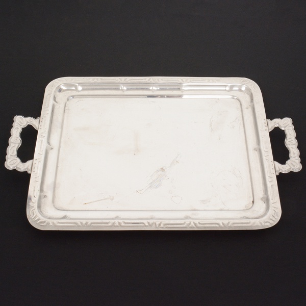 • METAL PRATEADO, uma (1) bandeja retangular, borda reforçada no padrão Império napoleônico com frisos intercalados por X, alças na mesma padronização e com elementos vegetalistas, medindo 41 x 31 cm mais as alças, manufatura FRACALANZA (tradição dede 1884), sinais de uso, vide foto.