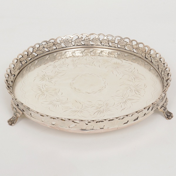 • METAL PRATEADO, uma (1) salva circular, ornamentação do fundo burilado em flores, acabamentos executados com carretilhas, borda vazada em elementos vegetalistas, pés com terminações em garras e elementos vegetalistas, sem punções aparentes, medindo 21 cm diâmetro, sinais de uso, vide foto.