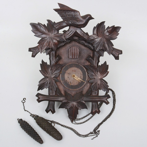 • RELÓGIO, um (1) carrilhão de parede, dito cuco, gabinete entalhado em madeira, em elementos vegetalistas encimado por pássaro, mostrador em metal com algarismos romanos, possui os pêndulos, medindo 39 cm altura, usado, não testado e sem garantia, vide foto.