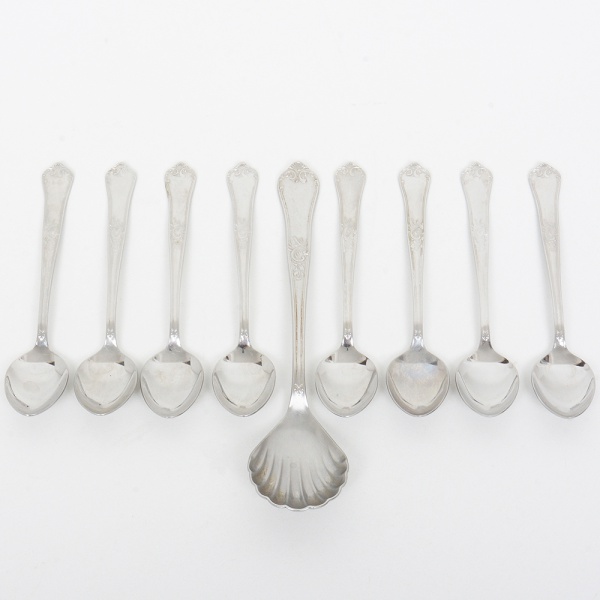 • FAQUEIRO, conjunto para café com nove (9) itens: 1 concha para açucareiro e 8 colheres de café, confeccionadas em aço inox, manufatura HÉRCULES, cabos com ornamentação relevada em frisos e elementos vegetalistas, praticamente sem uso, medindo a maior peça 14 cm comprimento, vide foto.