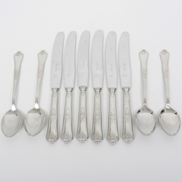 • FAQUEIRO, dez (10) talheres de sobremesa confeccionados em aço inox, manufatura HÉRCULES, cabos com ornamentação relevada em frisos e elementos vegetalistas, sendo: 4 colheres e 6 facas, praticamente sem uso, vide foto.
