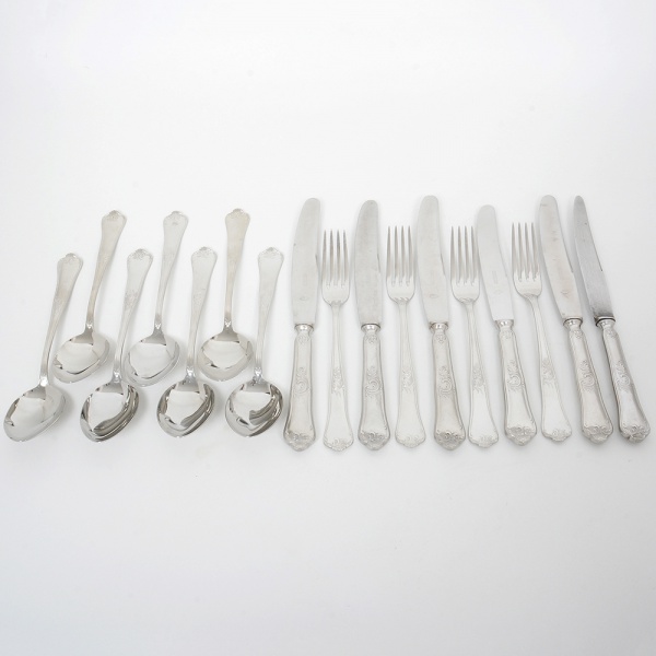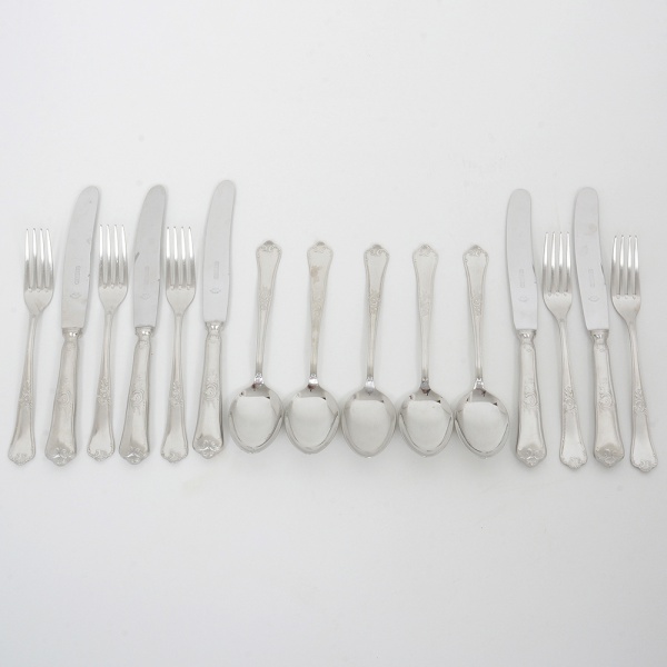 • FAQUEIRO, quinze (15) talheres de sobremesa confeccionados em aço inox, manufatura HÉRCULES, cabos com ornamentação relevada em frisos e elementos vegetalistas, sendo: 5 colheres; 5 garfos e 5 facas, praticamente sem uso, vide foto.