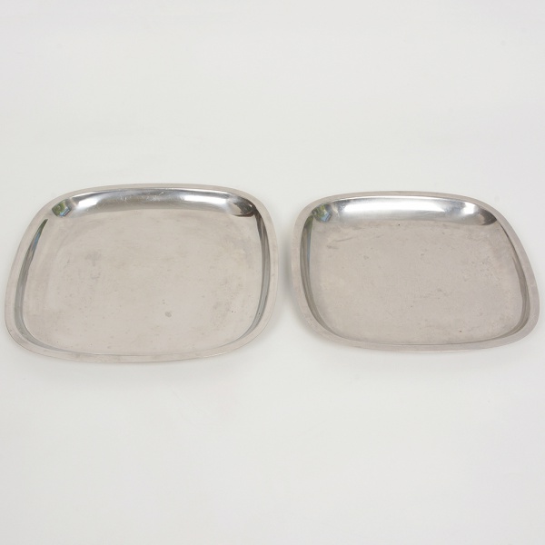 • AÇO INOX, duas (2) travessas quadrangulares de tamanhos distintos, medindo 16,5 x 16,5 cm e 29 x 29 cm, ambas com sinais de uso, vide foto.