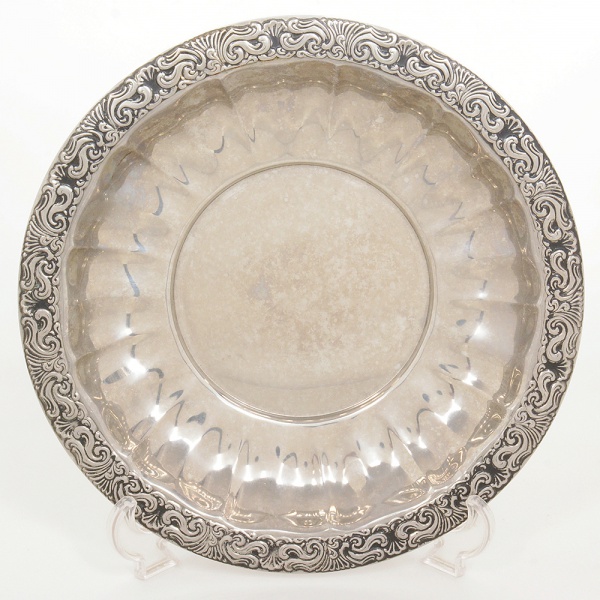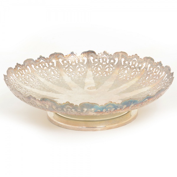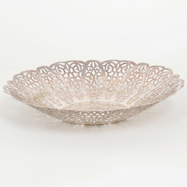 • METAL PRATEADO, uma (1) pequena fruteira, borda recortada e vazada em elementos vegetalistas estilizados, sem marca de manufatura aparente, medindo 22,5 cm diâmetro, sinais de uso, vide foto.