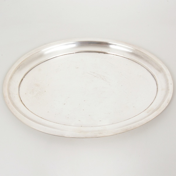 • METAL PRATEADO, uma (1) travessa oval, lisa, sem marca de manufatura aparente, medindo 42 x 31 cm, sinais de uso, vide foto.