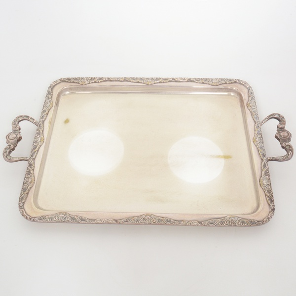 • METAL PRATEADO, uma (1) bandeja retangular, borda reforçada e relevada em volutas e elementos vegetalistas, alças idem, manufatura MERIDIONAL, medindo 43 x 33,5 cm mais as alças, sinais de uso, vide foto.